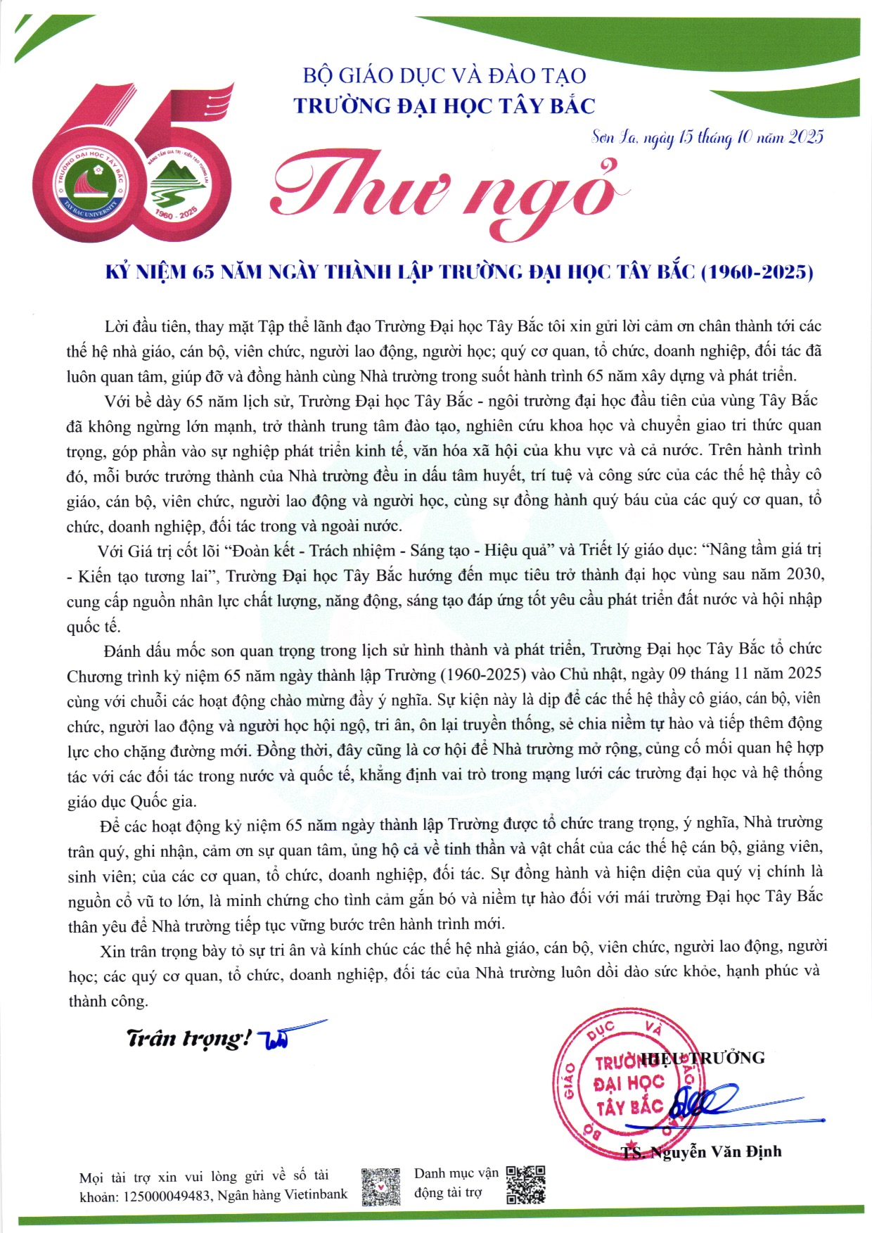 Chương trình Kỷ niệm 65 năm thành lập Trường Đại học Tây Bắc. Cơ hội gặp gỡ, giao lưu với cựu giáo chức, cựu sinh viên, giảng viên và sinh viên trong phạm vi toàn trường.